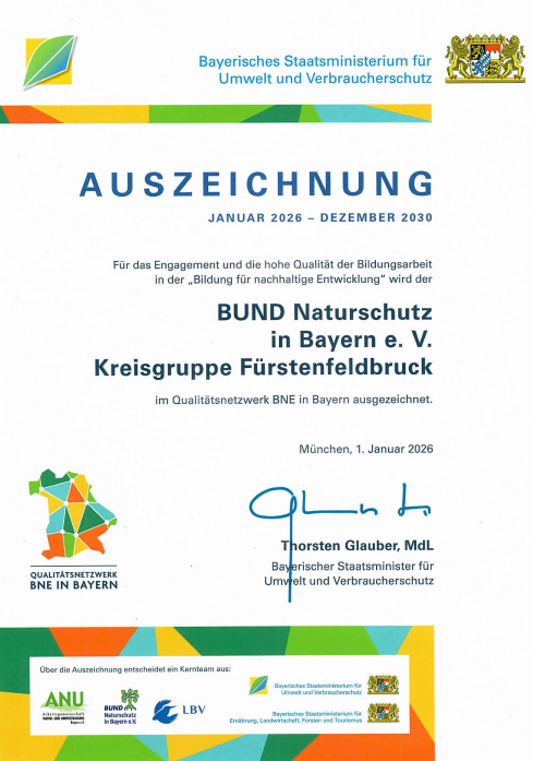 Für das Engagement und die hohe Qualität der Bildungsarbeit in der Bildung für nachhaltige Entwicklung (BNE) wird der BUND Naturschutz in Bayern e.V., Kreisgruppe Fürstenfeldbruck erneut ausgezeichnet.