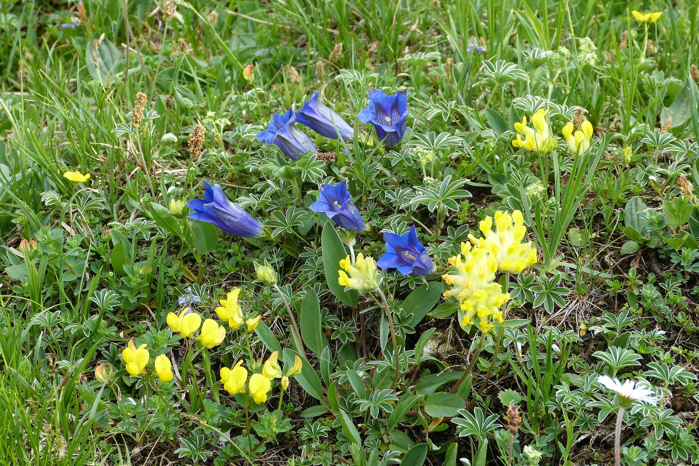 Die Hobby-Botaniker unter uns kamen schnell auf ihre Kosten. Unser pflanzenkundiger Begleiter und BN-Vorsitzende in Türkenfeld, Peter Brill, half gern bei der Bestimmung der selteneren Gebirgspflanzen. Zunächst säumten die pusteblume-ähnlichen Samenständen der Weißen Pestwurz und hellviolett-blühende Mondviolen unseren Weg. Der erste Aufstieg wurde bald mit einem weiten Blick auf Gebirgswiesen, hochumrahmt von felsigen Berghängen, belohnt. Wir erfreuten uns an verschiedenen Arten von Enzian, Alpenfettkraut und anderen Gewächsen mit ihren Blüten, die farbenfrohe Tagfalter anzogen, die nur im Hochgebirgsklima leben.