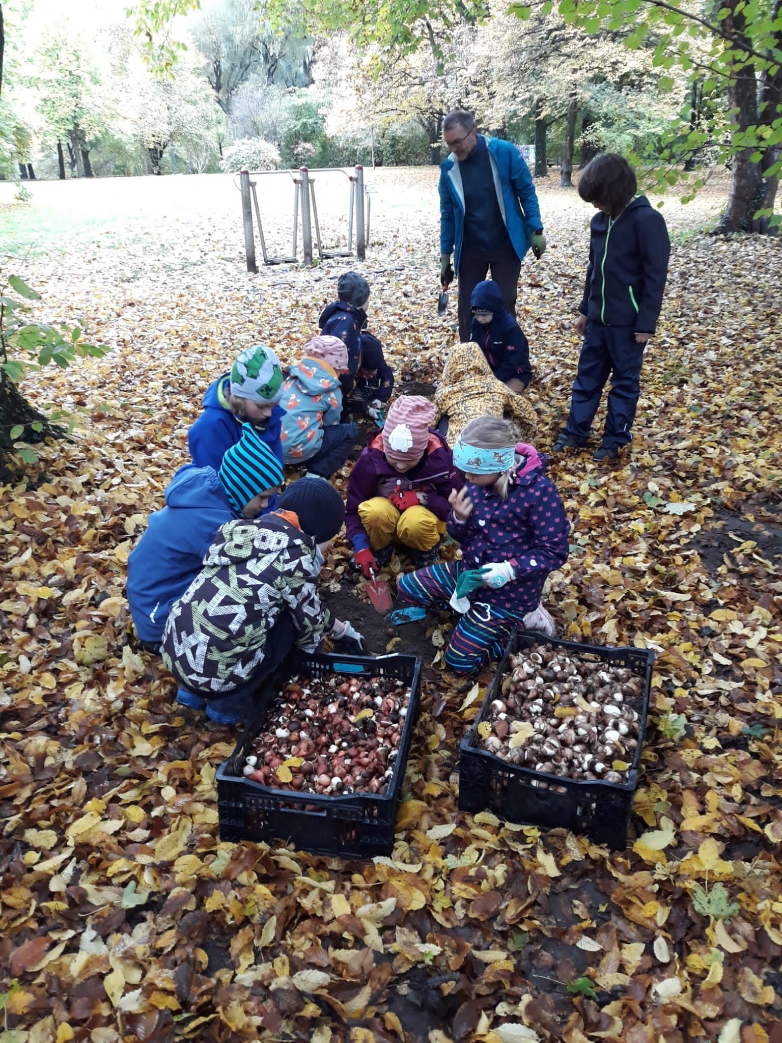 11 fleißige Arbeiter*innen hatten großen Spaß daran und brachten bei Wind und Regen Dutzende Zwiebeln von Frühblühern in die Erde ein. Unter Anleitung der beiden BN Umweltbildner Anke Simon und Nico Schneider fanden Märzenbecher, Krokusse und viele andere Sorten ein schönes Plätzchen auf den Grünflächen rund um den Marthabräuweiher. Die Kinder der hiesigen BN Gruppe, im Alter von 5-10 Jahren, lernten so spielerisch wie tief eine Zwiebel in die Erde gepflanzt werden muss! „Immer die zweifache Größe nehmen, „meinte Nico Schneider! Und bei manchen Zwiebeln erkannten die Kinder auch nicht sofort, wo oben und unten sei. Aber im Nu hatten es die schlauen Naturfreunde heraus, fegten die Blätter auf die Seite und gruben die passenden Pflanzlöcher. „Mit der Spitze nach oben und dann Erde drauf“ meinte Lukas. Eine besondere Behandlung brauchen die kleinen runden Kraftpakete übrigens nicht, weder Düngung noch eine spezielle Erde. Für ihren Start im Frühling bringen sie schon alles mit.