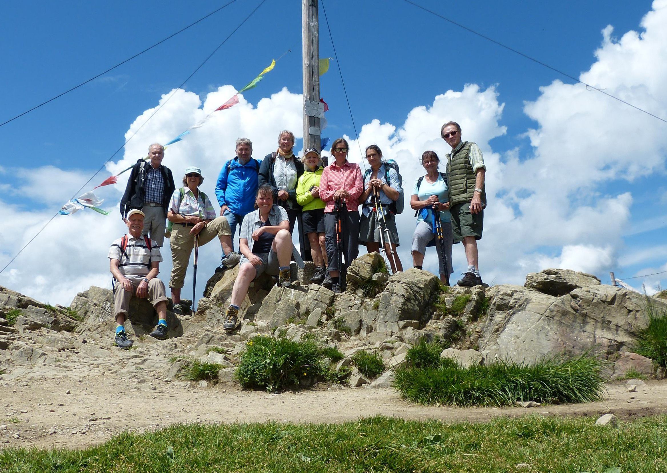 Geführt wurden wir von der ortskundigen BN-Frau Irmela Fischer. Bedingt durch die sommerlichen Temperaturen in April und Mai des Jahres 2018 standen schon die ersten Alpenrosen in Blüte. Zu besichtigen waren auf den talseitigen Feuchtwiesen seltene Farne, Sumpfdotter- und Trollblumen, Wiesenschaumkraut und weißer Hahnenfuß. In höheren Lagen fanden sich stattliche Knabenkräuter, das halbschmarotzende Läusekraut, Fransenglockenblume, Arnika und verschiedene Enzianarten, u.a. der Tüpfel-Enzian. Zahlreiche Schmetterlinge begleiteten unseren Aufstieg. Auf dem Gipfel bot sich uns eine herrliche Rundumsicht über die Allgäuer Berge. Nach einer ordentlichen Brotzeit stiegen wir über einen Grat wieder ab. Die wertvolle Flora und Fauna und die schwierigen geologischen Verhältnisse bestärkten uns in unserer Einstellung, dass hier ein Skizirkus fehl am Platz sind. Das nahe Balderschwang ist bis jetzt eher ein Positivbeispiel für ganzjährigen sanften Bergtourismus, weitgehend im Einklang mit der Natur. Dies sollte so bleiben!