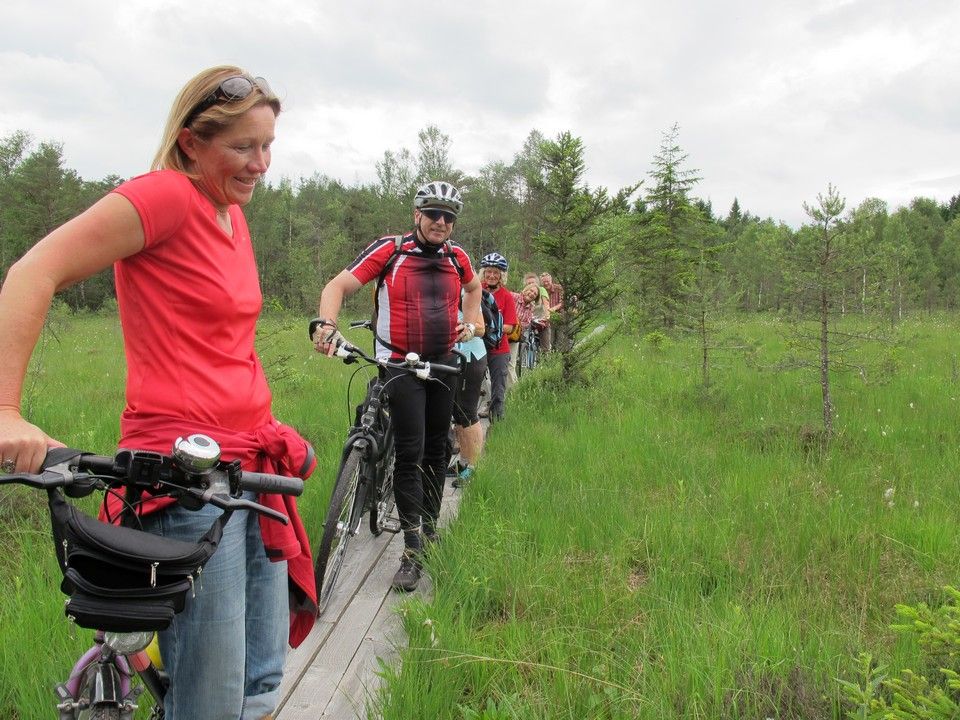 Vor den Toren der reizvollen Wallfahrts-Hardtkapelle machten wir ausgiebig Brotzeit, bevor es per Rad zum Teil über Bretterstege durch Hochmoore zur zweiten Station, der schwarzen Lacke ging. Der kleine See liegt ebenfalls in einem Hochmoor. Durch die stufenweise Aufstauung des Wassers wird auch das Moor wiedervernässt. Das steigende Wasser sorgt dafür, dass die wertvolle moortypische Vegetation wieder zum Vorschein kommt.