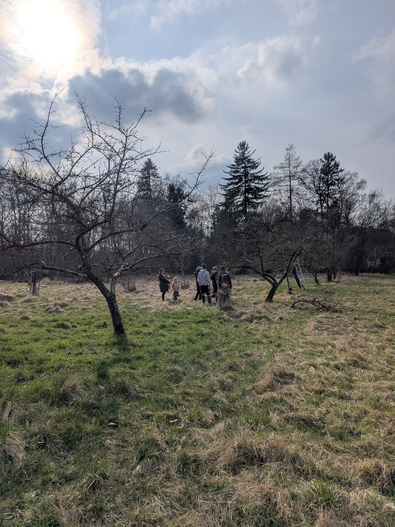 Bei den Schnitten konzentrierten sich die 15 Teilnehmenden, darunter drei Familien mit Kindern, vor allem auf die Schnitte, die die Stabilität der Bäume sicherstellen sollten. Das war bitter nötig, da vor einigen Jahren ein Pächter auf einer Seite alle Äste einer Obstbaumreihe ab ca. einem Meter Entfernung vom Stamm abgesäbelt hatte.